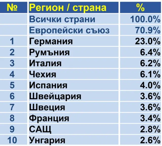 Най-много продукция – 23% се изнася в Германия. От тази гл.т. в зависимост от това как се развива ситуацията в Германия, зависи и развитието на българската електроиндустрия. „През последните 2 години (бел. ред. 2023 и 2024 гг.) в Германия имаше рецесия, което се отрази на нас и на българската ел. индустрия. През 2025 г. тенденцията във ФРГ се промени и се наблюдава лек растеж от 0.2%, което на този етап дава позитивни очаквания, но кой знае какъв ефект не може да се наблюдава. Надяваме се тази тенденция в близките години да се затвърди“, допълни инж. Димитров.