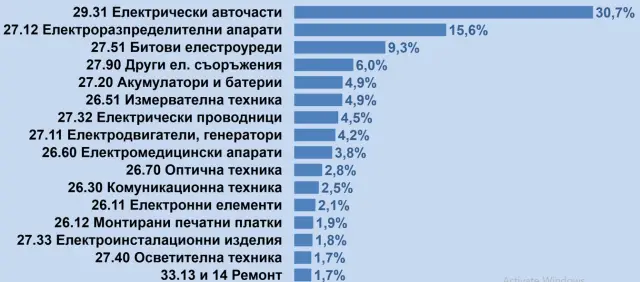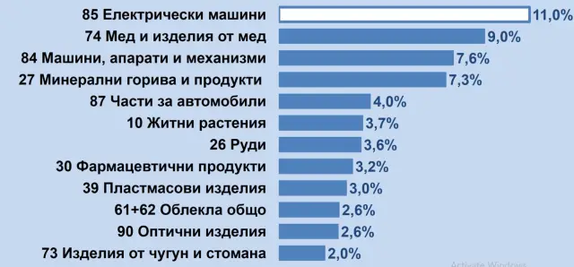 За 10-та година електроиндустрията е с най-висок дял при износа – 11%. Следват секторите „Мед и изделия от мед“ – 9% и „Машини, апарати и механизми“ – 7.6%.