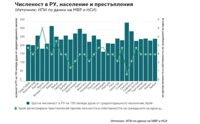 От графиката е видно, че е налице драстично несъответствие между численост и престъпления, което поражда потребности от оптимизиране на числения състав по области, особено наложително за Смолян, Кърджали, Варна, Пловдив и др.