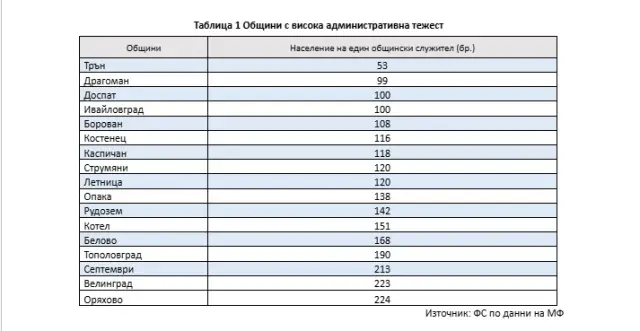 Тези общини имат много по-нисък коефициент население на един общински служител (бр.), отколкото средния за страната от 262. Според МФ общините от този списък се нуждаят от финансово оздравяване.