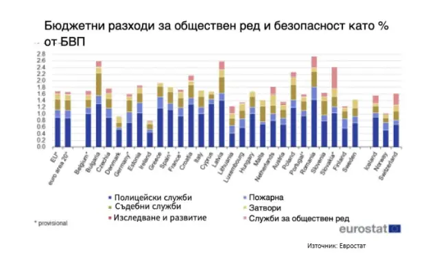 Разходите за вътрешен ред и сигурност в България като дял от БВП са едни от най-високите в ЕС – 2,6% при средно за ЕС и еврозоната 1,7% (Евростат, 2023 г.).