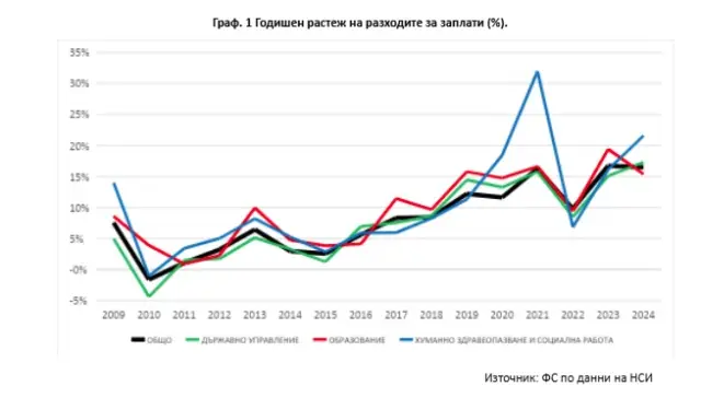 Средната брутна работна заплата в обществения сектор е 2 400 лв. през 2024 г., като се увеличава с 15% спрямо предходната година. С подобен темп нарастват заплатите в трите най-големи сектора. В графика 1 по-долу се вижда годишният растеж на разходите за заплати, сравнен с общия растеж на публичния сектор. Отново се потвърждава ускореният растеж на хуманното здравеопазване и социална работа, особено през годините на пандемията, но и през 2024 г. След него е отрасълът на образованието, докато държавното управление е с най-умерен растеж.