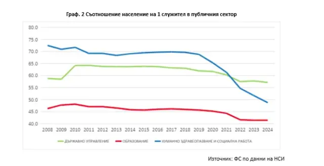 Този извод се потвърждава и от графика 2, където рязкото намаление на съотношението население на 1 служител потвърждава изпреварващия ръст на хуманното здравеопазване и социална работа.