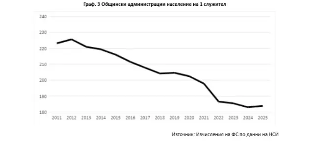 С изпреварващ ръст се отличават общинските администрации, които за периода 2011-2025 (юни) г. се увеличават с 2 184 души. При тях съотношението население на 1 служител по изчисление на ФС по данни на НСИ намалява от 223,2 през 2011 г. на 183,9 през юни 2025 г., т.е. налице е съществено увеличаване на административната тежест, показано в графика 3.