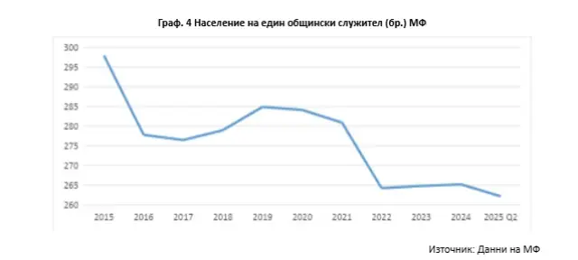 Този извод се потвърждава от данните за съотношението население на един общински служител (бр.) на Министерство на финансите за периода 2015-2025 юни. Дори ако приемем изчисленията на МФ за по-точни от тези на Фискалния съвет по данни на НСИ, тенденцията не се променя, което може да се види от графика 4.