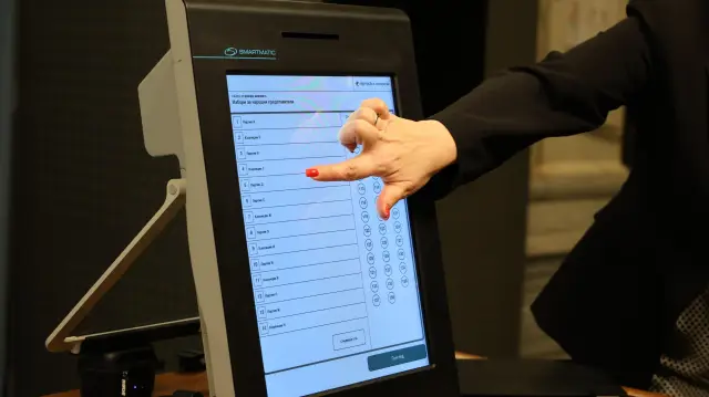 Избирателят поставя карта в устройството, след което се зарежда електронната бюлетина, разпределена на една или две страници според броя на участниците.