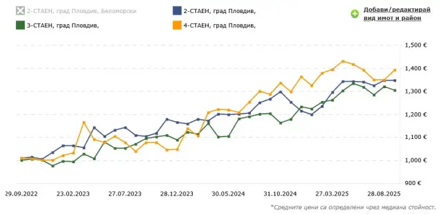 Средно цените на квадратен метър жилищна площ се увеличиха с около 30%, сочат данните на най-големия сайт за недвижими имоти imot.bg. При двустайните поскъпването за последните 3 години е 33% - от малко над 1000 EUR/кв.м през септември 2022 г. до 1300 EUR/кв.м към днешна дата. Увеличението при тристайните имоти е по-малко – 29% - отново от 1000 EUR/кв.м преди 3 години до почти 1300 EUR/кв.м днес. Предлагането на гарсониери почти липсва. Причината е, че при старото строителство почти липсва предлагане, а новото – не предлага подобни имоти, поради навлизането на нови архитектурни решения и липсата на печалба от тях за строителя. Затова повечето инвеститори, освен масовите 2- и 3-стайни апартаменти, предпочитат да оферират по-големи 4-стайни такива, вместо маломерни имоти. При апартаментите с 4 стаи се наблюдава по-голям процент поскъпване – 37%, а средната офертна цена към днешна дата приближава 1400 EUR/кв.м.