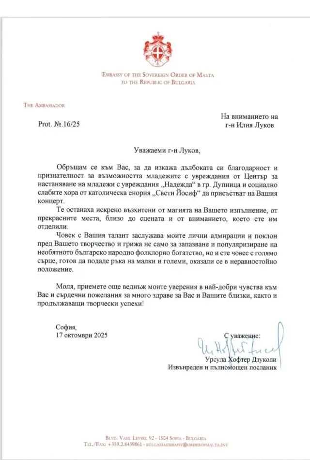 Извънредният и пълномощен посланик на Суверенния Малтийски орден в България, Урсула Хофтер Дзуколи, изпрати официално писмо до народния певец Илия Луков в знак на благодарност и признателност.