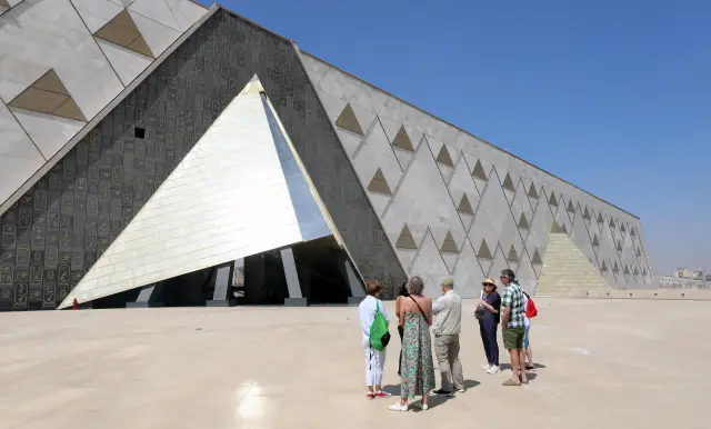 Проектиран от ирландската компания Heneghan Peng Architects, музеят, станал популярен като GEM (Grand Egyptian Museum), се отличава с триъгълна стъклена фасада, подобна на близките пирамиди.
