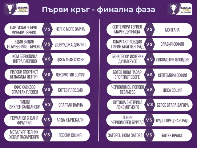 Жребият за Първи кръг основна фаза на Sesame Купа на България бе изтеглен днес. В този кръг се включват отборите от efbet Лига, които ще гостуват на победителя от мачовете във Втори кръг предварителна фаза. Мачовете ще се играят в периода 28-30 октомври.