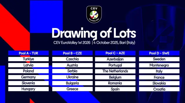 Женският национален отбор на България попадна в група B на тегления в Бари жребий за Европейското първенство по волейбол през 2026 година. Нашите момичета ще се изправят срещу домакините от Чехия, както и срещу отборите на Австрия, Сърбия и Украйна.