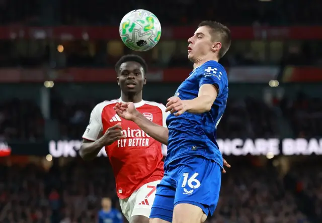 Микел Артета замени в 37-ата минута Тимбер, който получи контузия, с Москера. Минута след това Арсенал бе близо за пореден път да се разпише след корнер. Сака центрира, Калафиори отклони с глава на близката греда. Салиба бе напът да засече на далечната греда, на Пикфорд успя да докосне топката и да му попречи.