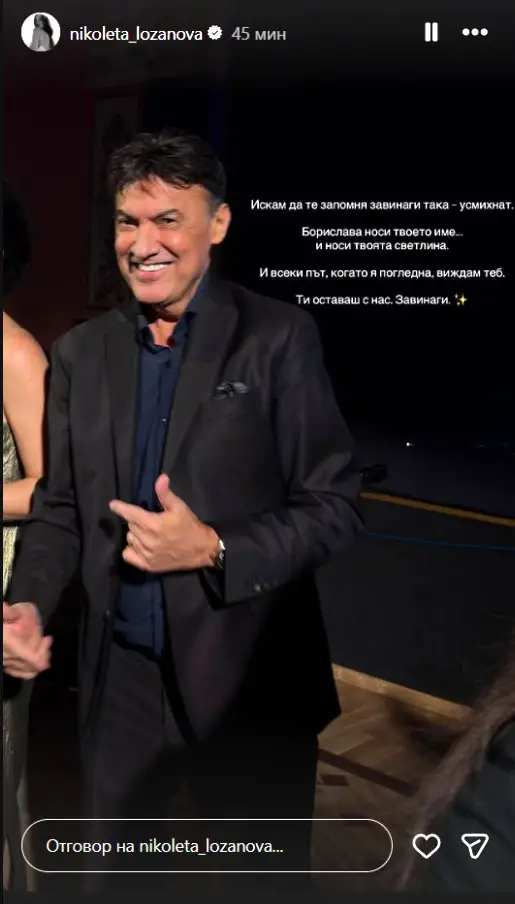 Искам да те запомня завинаги така - усмихнат, написа Николета Лозанова за свекъра си Борислав Михайлов, който почина тази сутрин в столична клиника на 63-годишна възраст.