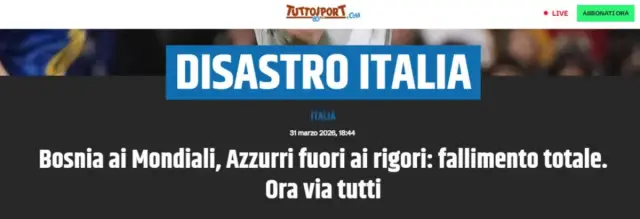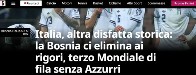 Италианските медии излязоха с гръмки заглавия и критики към националния си отбор, който за трети пореден път не успя да се класира за световно първенство. Това се случи след загубата от Босна и Херцеговина с 1:4 след дузпи (1:1 в редовното време и след продължения).