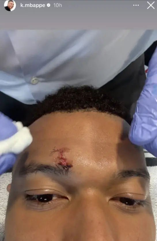 На снимката се вижда ясно видима рана над веждата на Мбапе, зашита с няколко шева.