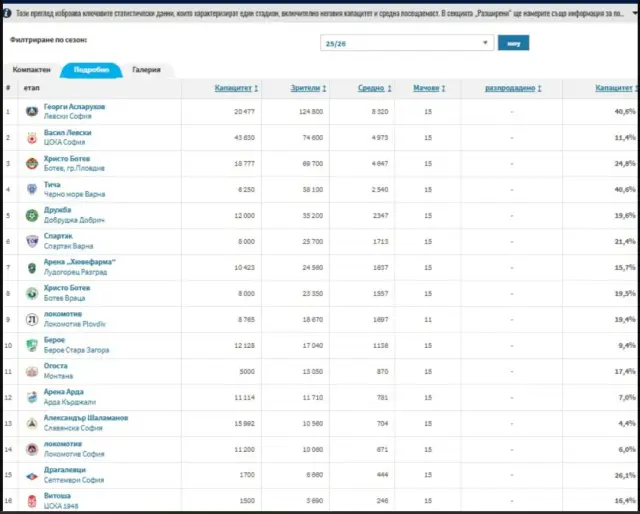 Благодарение на сериозната посещаемост в последното дерби срещу "сините", ЦСКА изпревари Ботев (Пловдив) в класацията - 4973 срещу 4647 продадени билета средно на мач. Следват Черно море и Добруджа в челната петица, а след тях се нареждат Спартак (Варна), Лудогорец, Ботев (Враца), Локомотив (Пловдив) и Берое в топ 10.